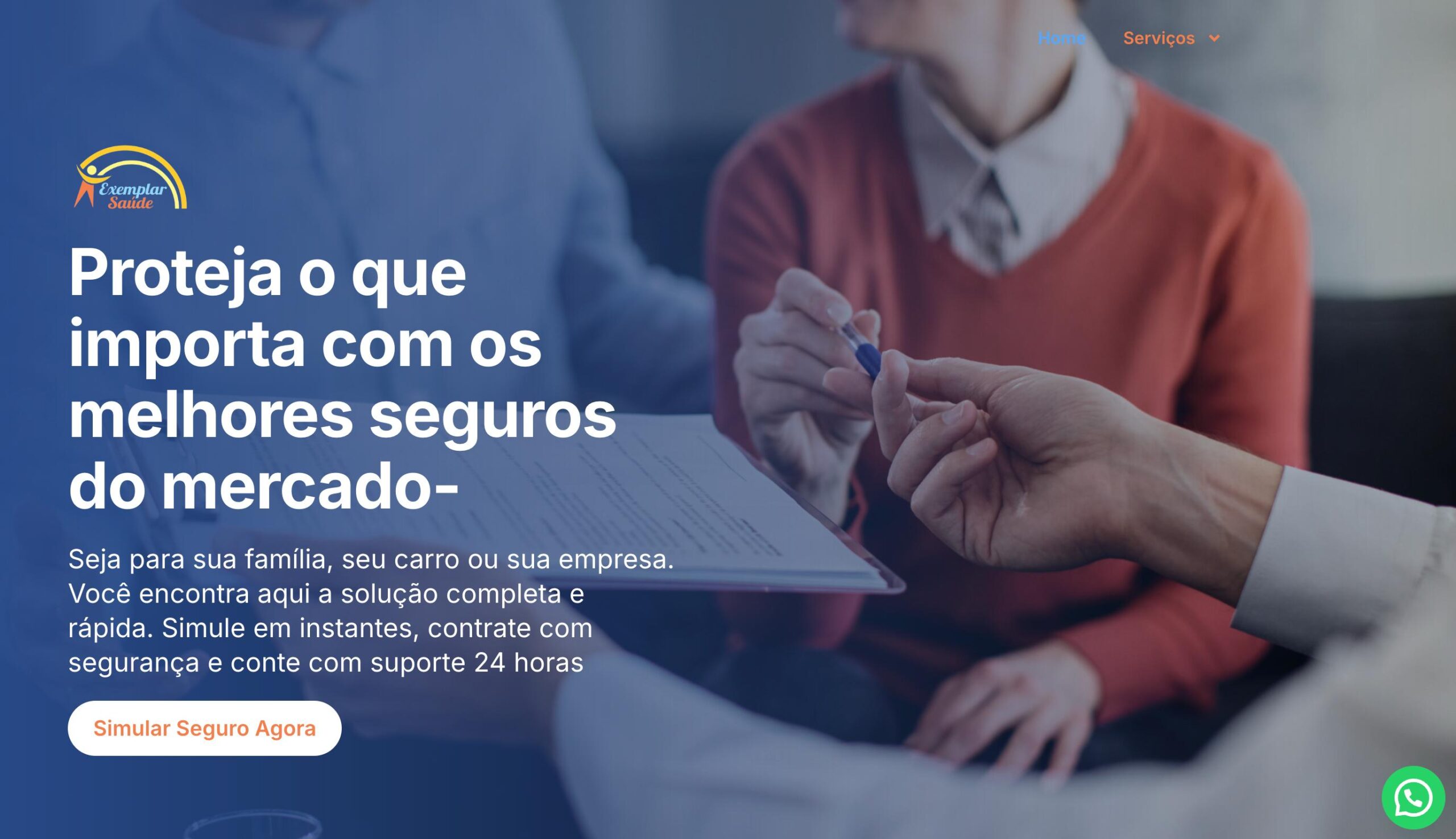 Exemplar Saúde Portal de corretora de seguros e planos de saúde com simulação online, atendimento 24h e área do cliente